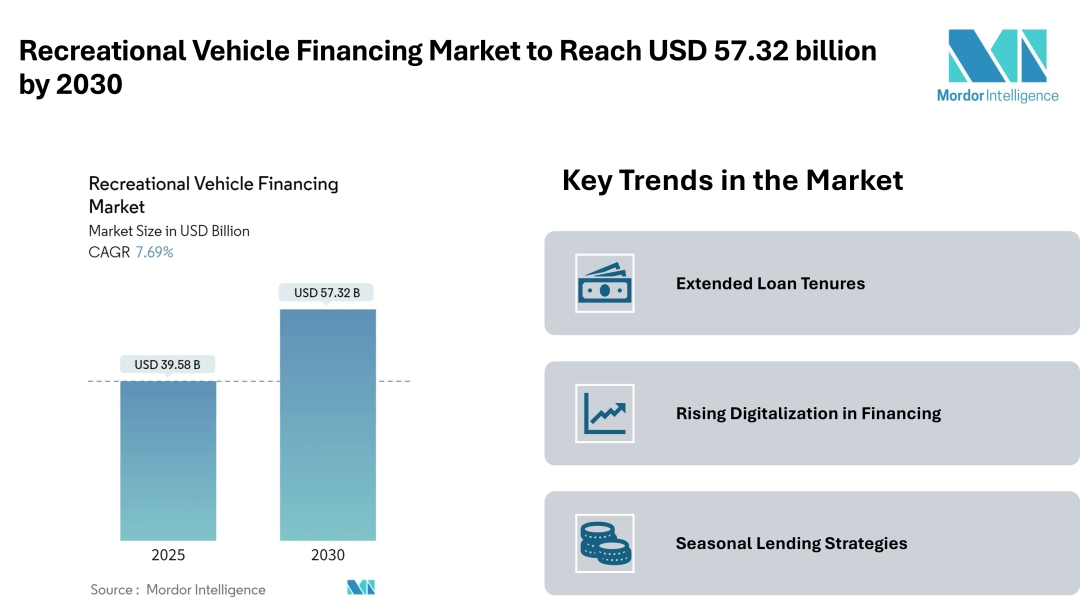 According to Mordor Intelligence, The Recreational Vehicle (RV) Financing Market is valued at USD 39.58 billion in 2025 and is projected to reach USD 57.32 billion by 2030, registering a 7.69% CAGR. This growth reflects a consistent demand for structured financing solutions that make recreational vehicles more affordable for individual buyers, families, and fleet operators.