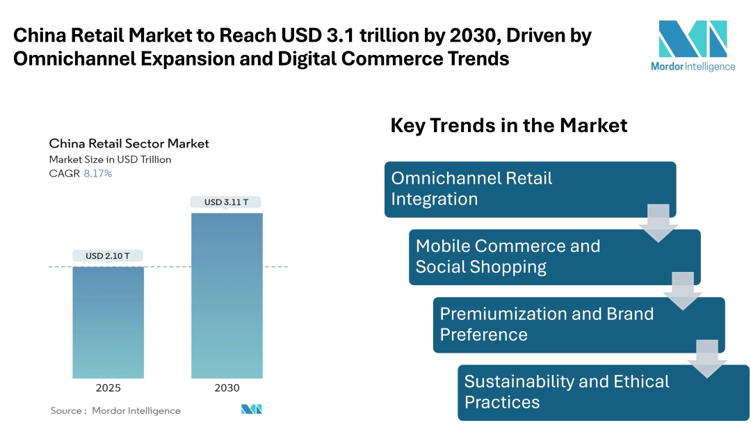 According to Mordor Intelligence, the China retail market size is valued at USD 2.1 trillion in 2025 and is forecast to reach USD 3.1 trillion by 2030, posting an 8.2% CAGR. This growth is supported by both physical retail formats and a mature e-commerce infrastructure that continues to influence consumer behavior. The China retail market remains one of the most dynamic consumer markets globally, supported by a vast population, rising urban income levels, and a deeply embedded digital ecosystem