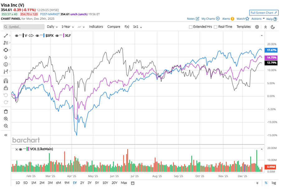 V stock has underperformed the S&P 500 Index’s ($SPX) 15.7% gains over the past 52 weeks, with shares up 11.3% during this period. Similarly, it underperformed the Financial Select Sector SPDR Fund’s (XLF) 13.5% gains over the same time frame.