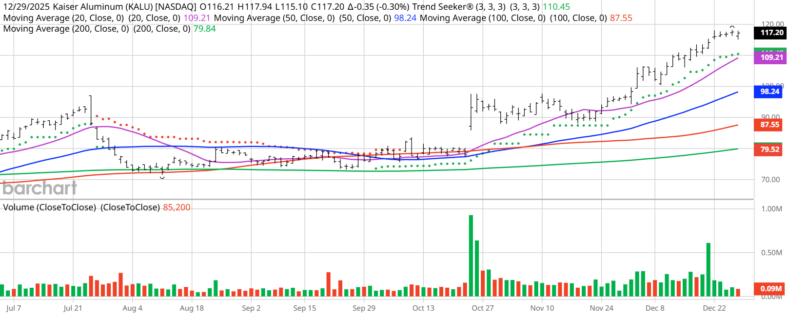 Kaiser Aluminum scored a new 3-year high of $119.13 on Dec. 30.