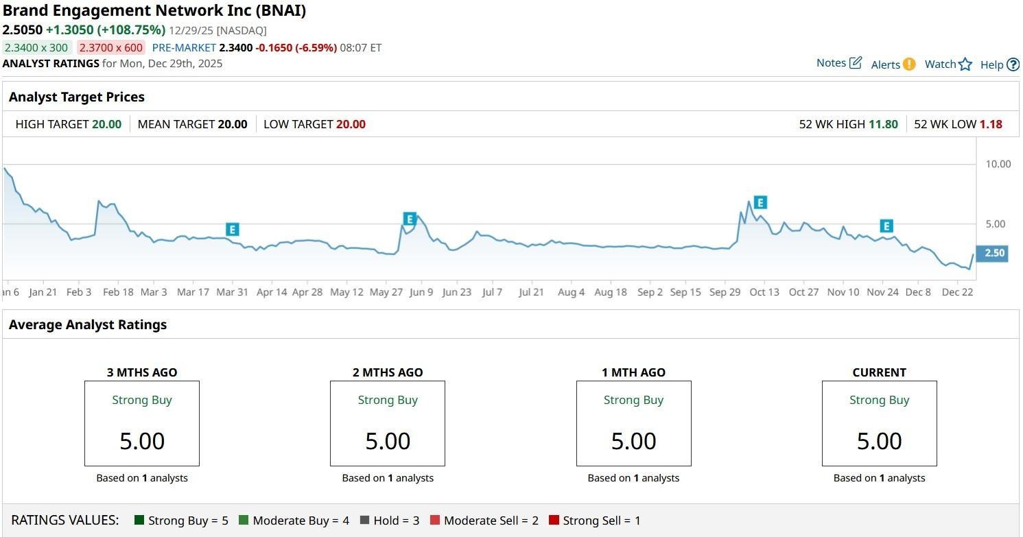 However, the only one who covers BNAI shares rates them at “Strong Buy” with a price target of $20, indicating potential for a 7x rally from here.