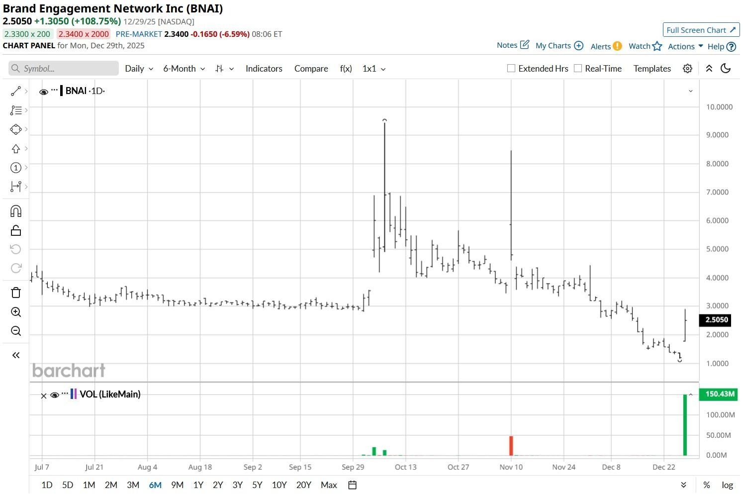 Brand Engagement Network (BNAI) shares more than doubled on Dec. 29 after the conversational artificial intelligence (AI) solutions firm secured a sizable contract from a leading ads agency.