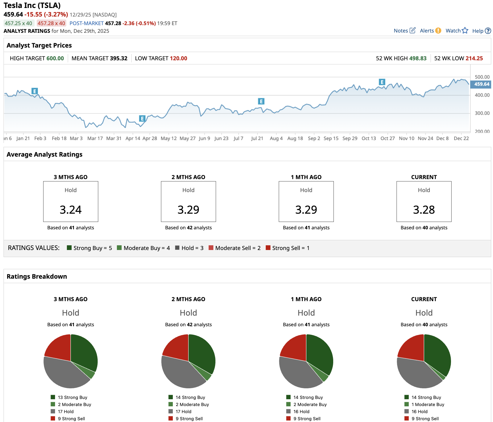 Out of the 40 analysts covering TSLA stock, 14 recommend “Strong Buy,” one recommends “Moderate Buy,” 16 recommend “Hold,” and nine recommend “Strong Sell.” The average TSLA stock price target is $395.32, below the current price of $460.