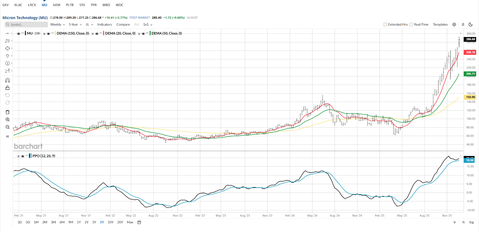And lastly, Micron Technology (MU) has had strong news flow in its favor. I’m not an investor who just assumes a stock will go higher after zooming up like this one. But I’ll say this: The more tech stocks that continue higher to start 2026, continuing these strong patterns from 2025, the more likely we are headed toward a year-2000 rise and fall redux.
