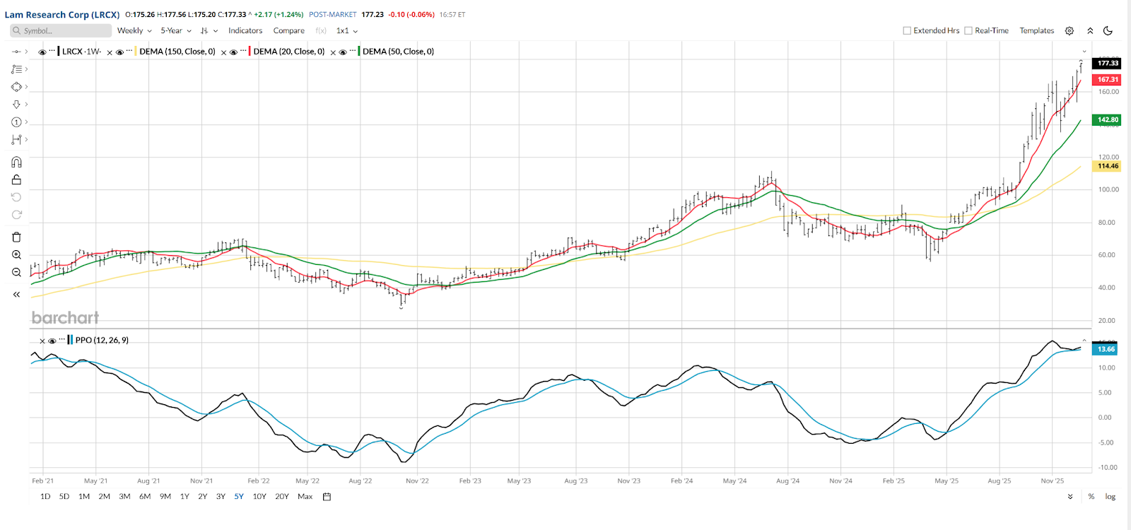 Here’s one of the tech stocks, KLA (KLAC). As with the sector in general, late 2025 has seen a recovery of the sharp dip, and these stocks may now be poised to start the new year by resuming runs through new highs. The 20-week moving average is often a strong signal, and it has been unwavering.