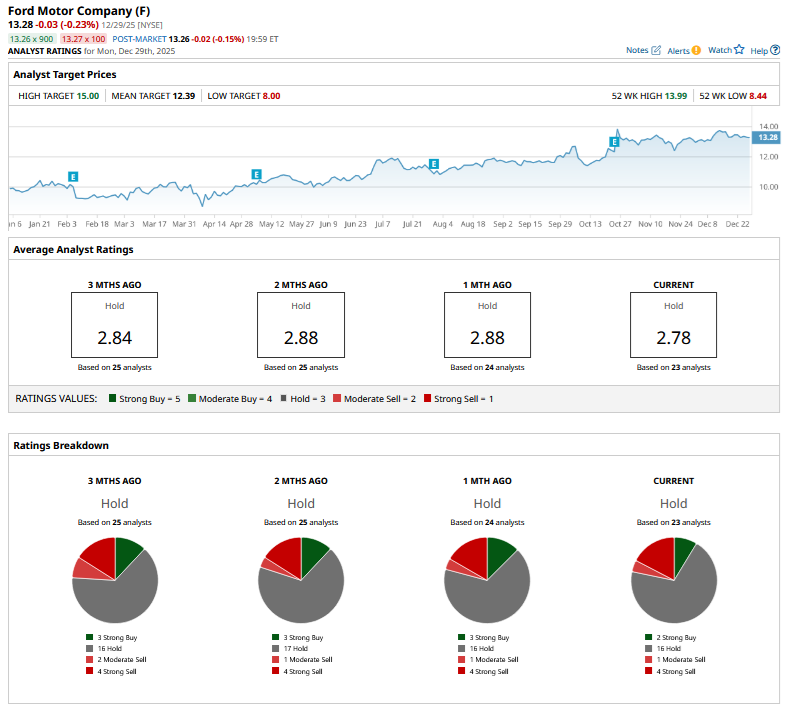Ford has a consensus rating of “Hold” from the 23 analysts polled by Barchart, while its mean target price of $12.39 is lower than current price levels. Even the Street-high target price of $15 is just about 13% higher.
