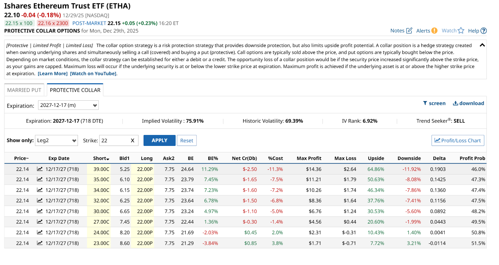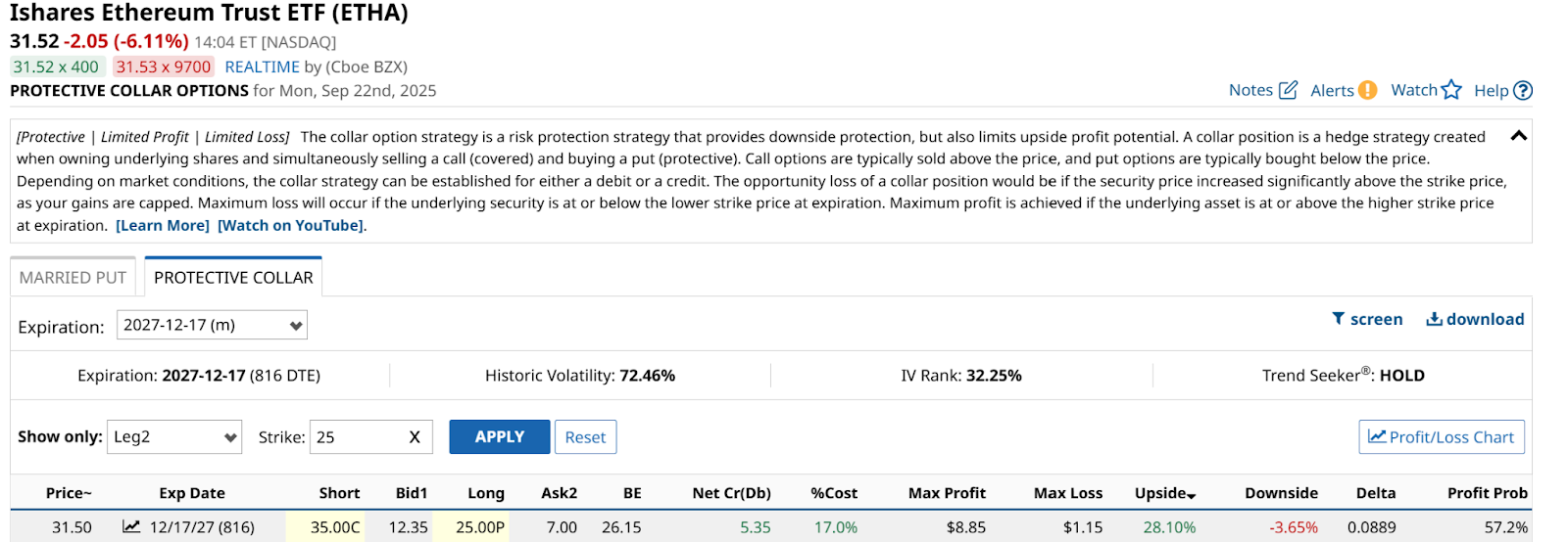 As it turned out, that created some pretty good option pricing a few months ago. I say that because with ETHA crashing recently, that collar would have allowed traders to take on the risk inherent in crypto, while creating an escape hatch in the form of a protective put option. Because it is part of the collar, along with the more familiar covered call segment of that trade.
