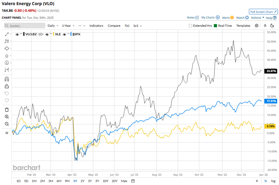 VLO stock has soared 37.9% over the past 52 weeks, outperforming the S&P 500 Index's ($SPX) 16.8% gain and the State Street Energy Select Sector SPDR ETF's (XLE) 6.4% rise over the same period.