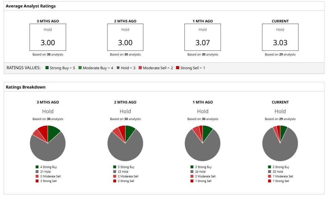 Based on the ratings of 29 analysts, LULU stock is a consensus “Hold.” While two analysts assign a “Strong Buy” rating to LULU, 25 analysts have “Hold” ratings and one analyst has a “Moderate Sell” rating. Further, one analyst has a “Strong Sell” rating on the stock.