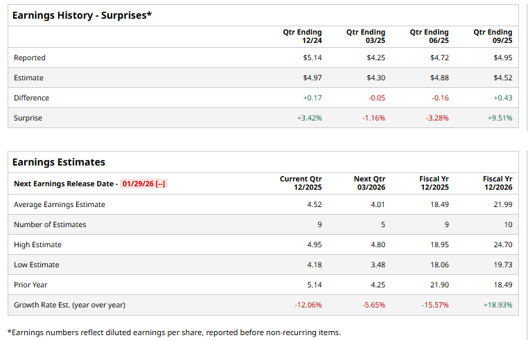 Headquartered in Irving, Texas, Caterpillar Inc. (CAT) is a leading global industrial firm specializing in construction and mining equipment, diesel and natural-gas engines, industrial gas turbines, and related services. Caterpillar’s scale and market presence are reflected in a market cap of around $268.1 billion. This industrial giant is expected to announce its fiscal fourth-quarter 2025 earnings soon.