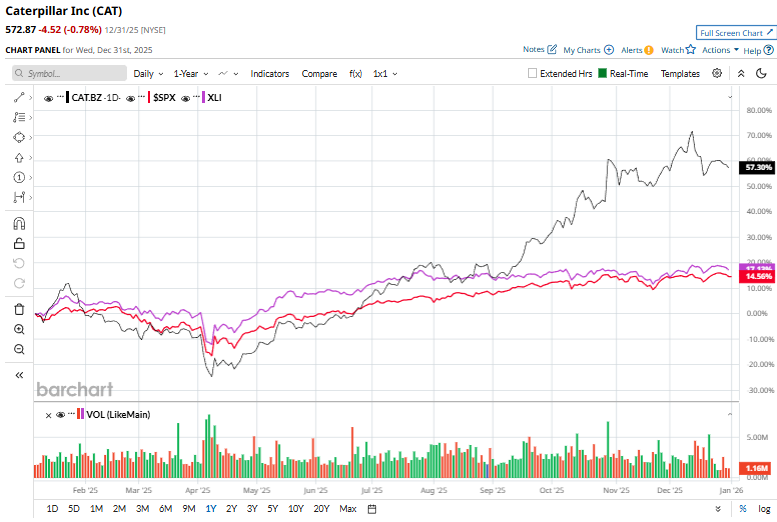 CAT stock has gained 57.8% over the past 52 weeks, significantly outperforming the Industrial Select Sector SPDR Fund’s (XLI) 17.6% surge and the S&P 500 Index’s ($SPX) 16.4% uptick during the same time frame.