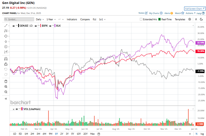 GEN shares have plunged marginally over the past year, trailing the S&P 500 Index’s ($SPX) 16.4% gains and the Technology Select Sector SPDR Fund’s (XLK) 22.8% gains over the same time frame.