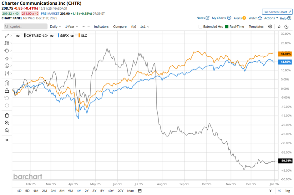 CHTR stock has decreased 39.2% over the past 52 weeks, lagging behind the S&P 500 Index's ($SPX) 16.4% gain and the State Street Communication Services Select Sector SPDR ETF's (XLC) 21.2% return over the same period.