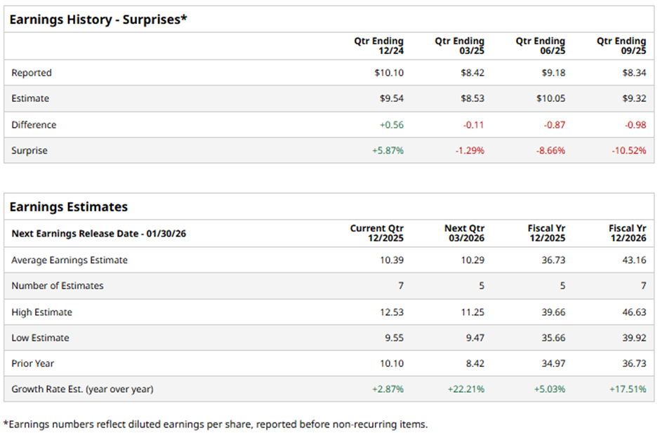 The Stamford, Connecticut-based company is expected to announce its fiscal Q4 2025 results on Friday, Jan. 30. Ahead of this event, analysts predict CHTR to report an EPS of $10.39, up 2.9% from the previous year's $10.10. It has surpassed Wall Street's bottom-line estimates in one of the past four quarters while missing on three other occasions.