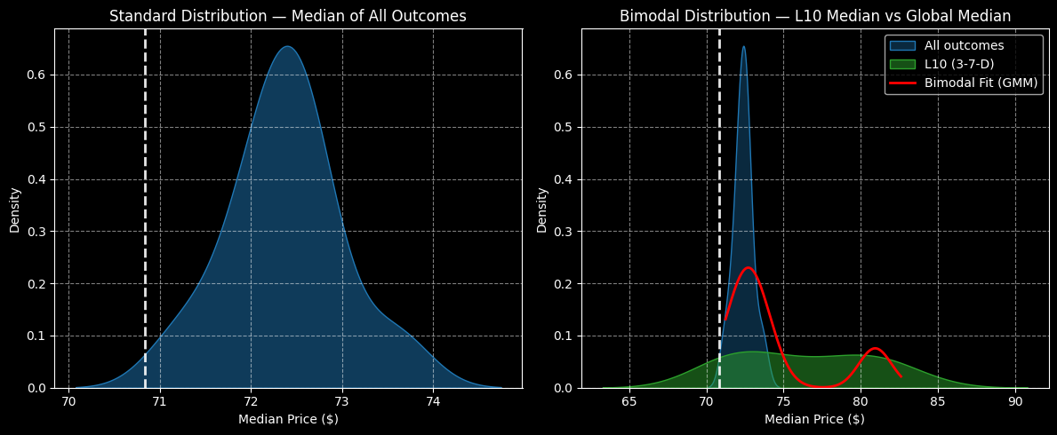 However, under a topological framework, outcome probability is inversely correlated with distance from the center of probability mass. In other words, what structural arbitrageurs are claiming is that the terminal price of a security over a fixed time period could be landing in a narrow range rather than somewhere in a wide dispersion.