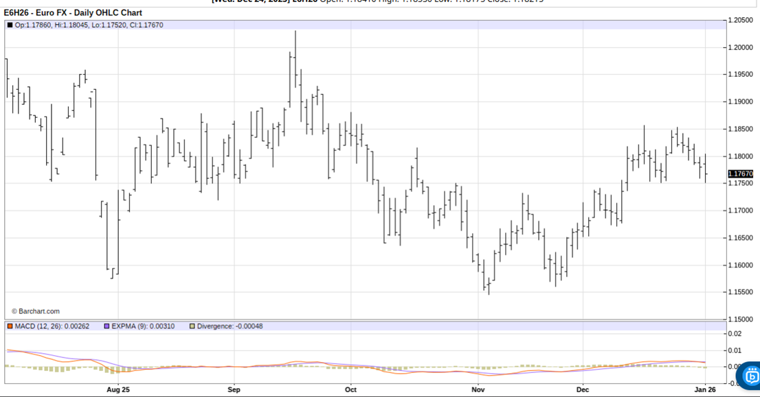 Fundamentally, sticky U.S. inflation and in turn a likely less-dovish-leaning Federal Reserve on its monetary policy in 2026 are bullish for the U.S. dollar and bearish for the Euro currency. There are also worries about European Union countries’ budget deficits that are Euro-currency-bearish.