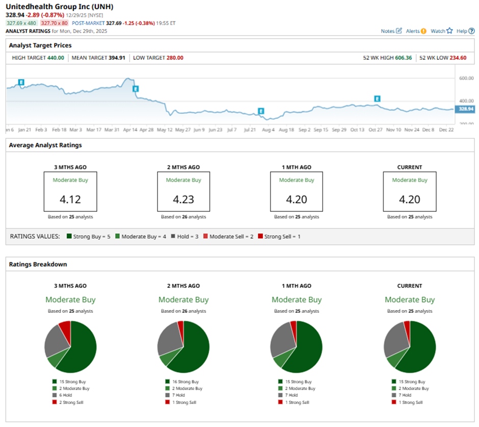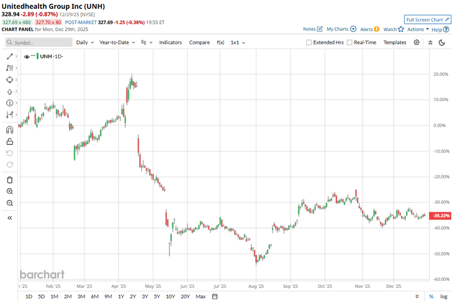 Over the course of 2025, UNH stock has delivered a notable negative return for the year, with total return showing a decline of around 33%, largely underperforming the broader S&P 500 Index’s (SPX) 17% gain over the past 52 weeks.
