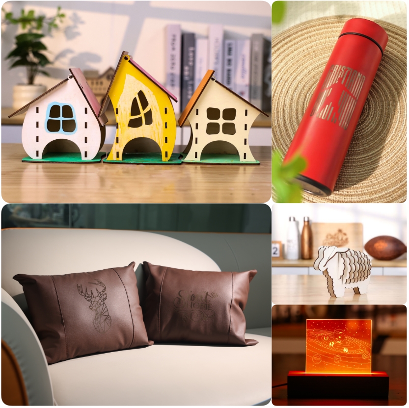 Ideal for small studios and commercial users, the high-power Ray5 40W laser easily handles the surge of New Year orders. It can engrave and cut hundreds of materials, including paper, wood, leather, and even metal, giving your creativity unlimited possibilities—from cutting and assembling charming wooden houses, adding custom designs to thermos bottles, to personalizing leather pillows. In addition, the Ray5 40W enhances cutting efficiency and expands material compatibility, transforming creative ideas into productive results. It’s the perfect choice for those seeking both efficiency and innovation, and a thoughtful gift for creators and DIY enthusiasts alike.