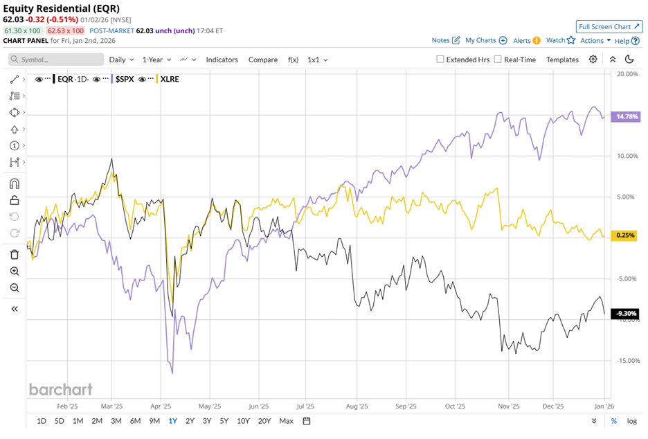 From a stock performance perspective, Equity Residential’s shares have faced relative pressure. Over the past 52 weeks, shares declined 11.5%, although they remain up 1.6% year-to-date (YTD). In contrast, the S&P 500 Index ($SPX) gained 16.9% over the same annual period while remaining only marginally positive YTD.