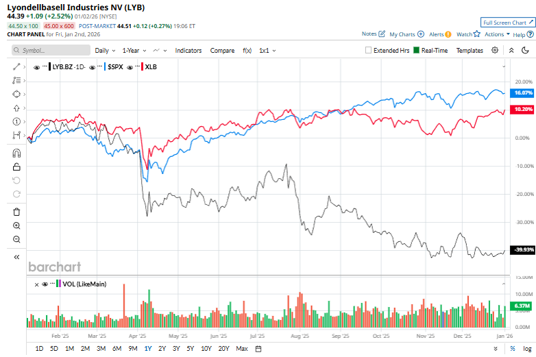 LYB stock prices have tanked 39% over the past 52 weeks, notably underperforming the S&P 500 Index’s ($SPX) 16.9% returns and the Materials Select Sector SPDR Fund’s (XLB) 10.9% decline during the same time frame.