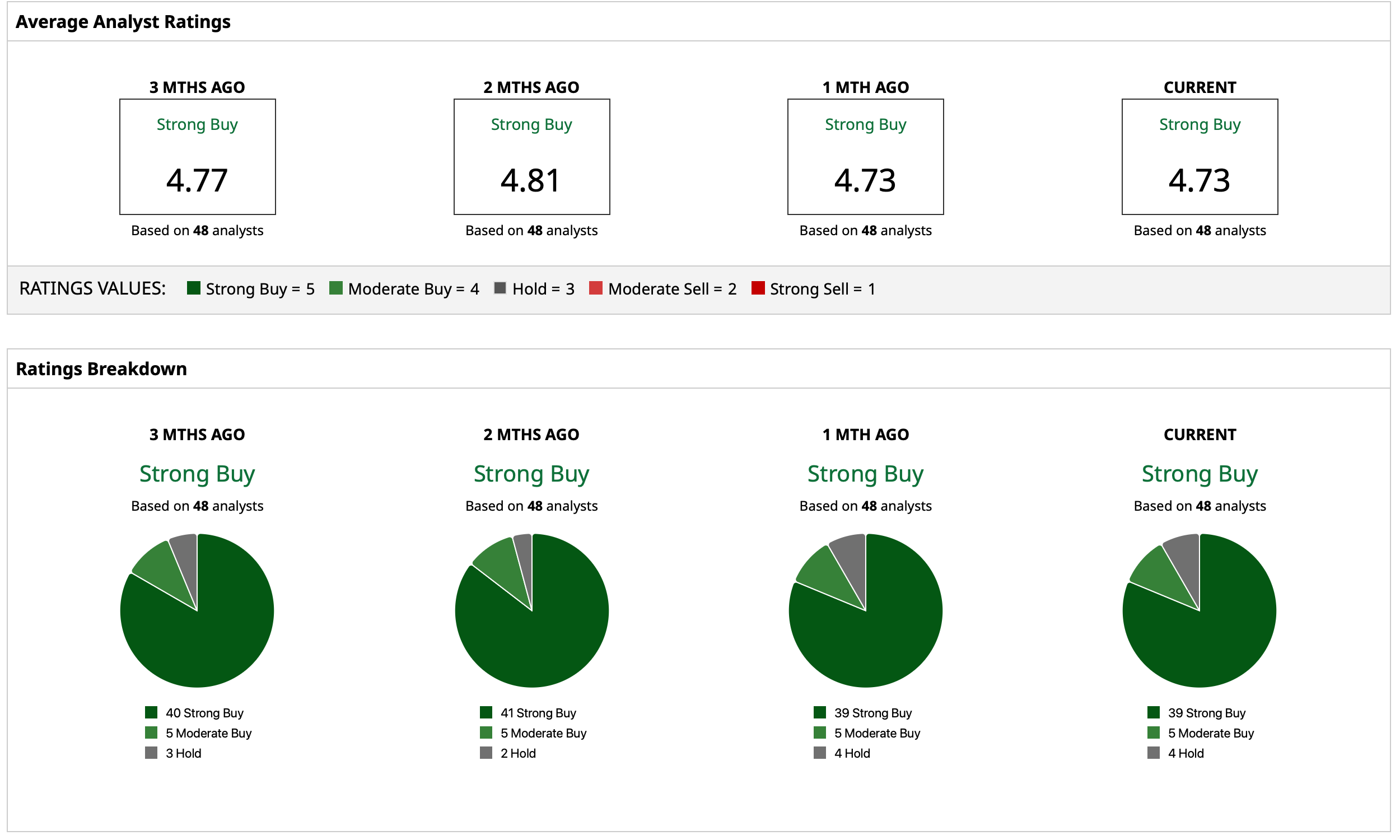 Analysts attribute a consensus rating of “Strong Buy” for MSFT stock with a mean target price of $630.07. This target denotes upside potential of about 33% from current levels. Out of 48 analysts covering the stock, 39 have a “Strong Buy” rating, five have a “Moderate Buy,” and four have a “Hold” rating.