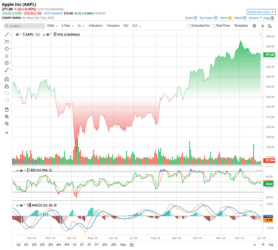 The chart tells a story of recovery forged through volatility. After sliding into the $200 zone in early August, AAPL found a firm footing and began a disciplined climb. Momentum carried the stock past $280 in December, peaking at $288.62 on Dec. 3 before profit-taking dragged it back toward the $270 range. Over the past month, shares have declined roughly 3% with volume thinning, suggesting hesitation rather than panic.