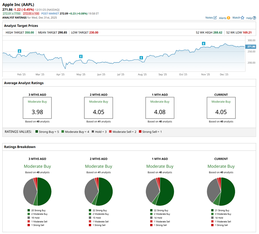 AAPL stock has a consensus “Moderate Buy” rating overall. Out of 41 analysts covering the tech stock, 21 recommend a “Strong Buy,” three give a “Moderate Buy,” 15 analysts stay cautious with a “Hold” rating, one has a “Moderate Sell” rating, and one analyst has a “Strong Sell” rating.