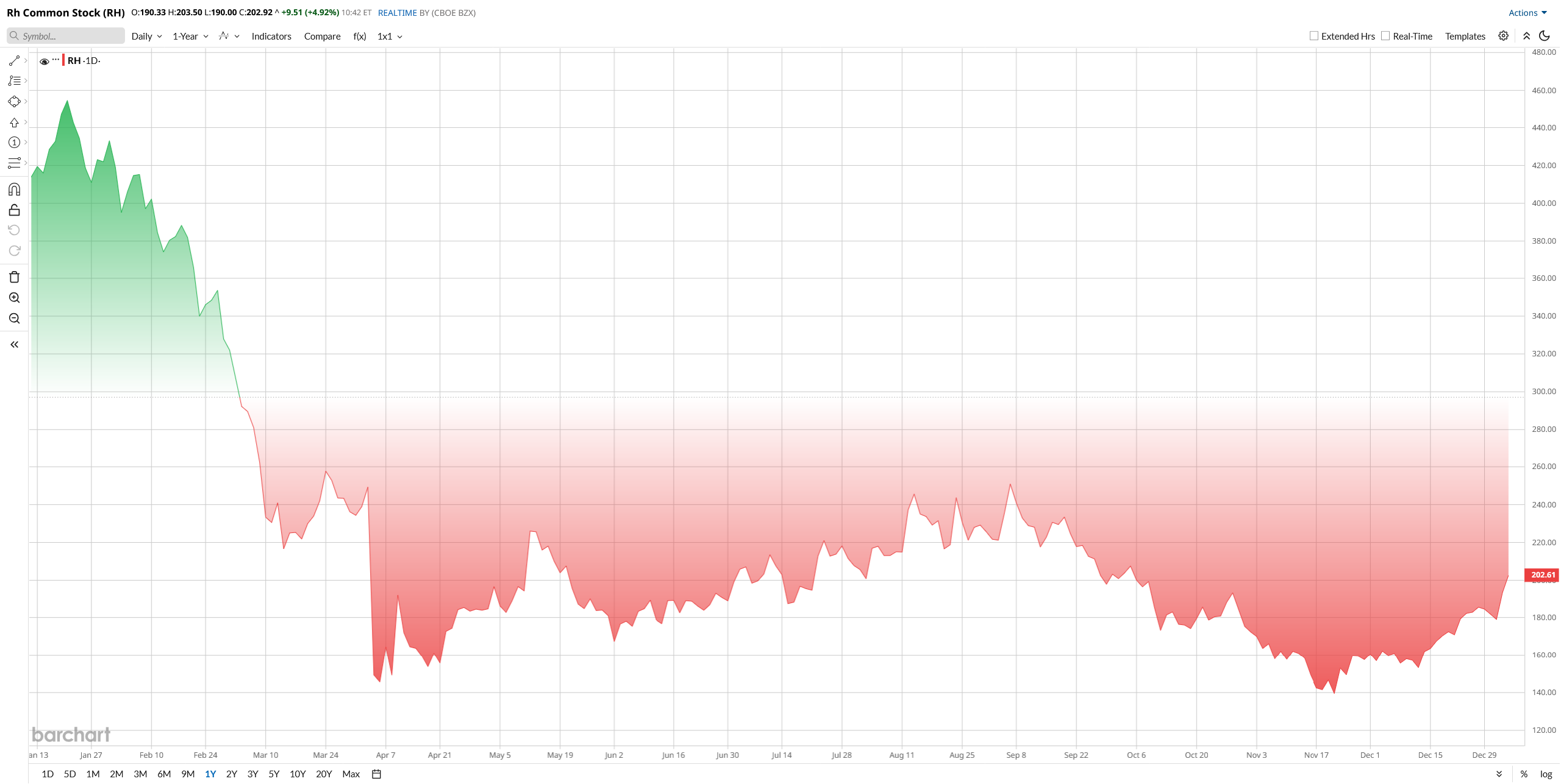 Having a small cap of $3.6 billion, RH shares had a difficult 2025, declining sharply as high mortgage rates and slowing home sales weighed on demand for big-ticket furnishings. The stock fell more than 50% year-to-date (YTD) before rebounding late in the year.