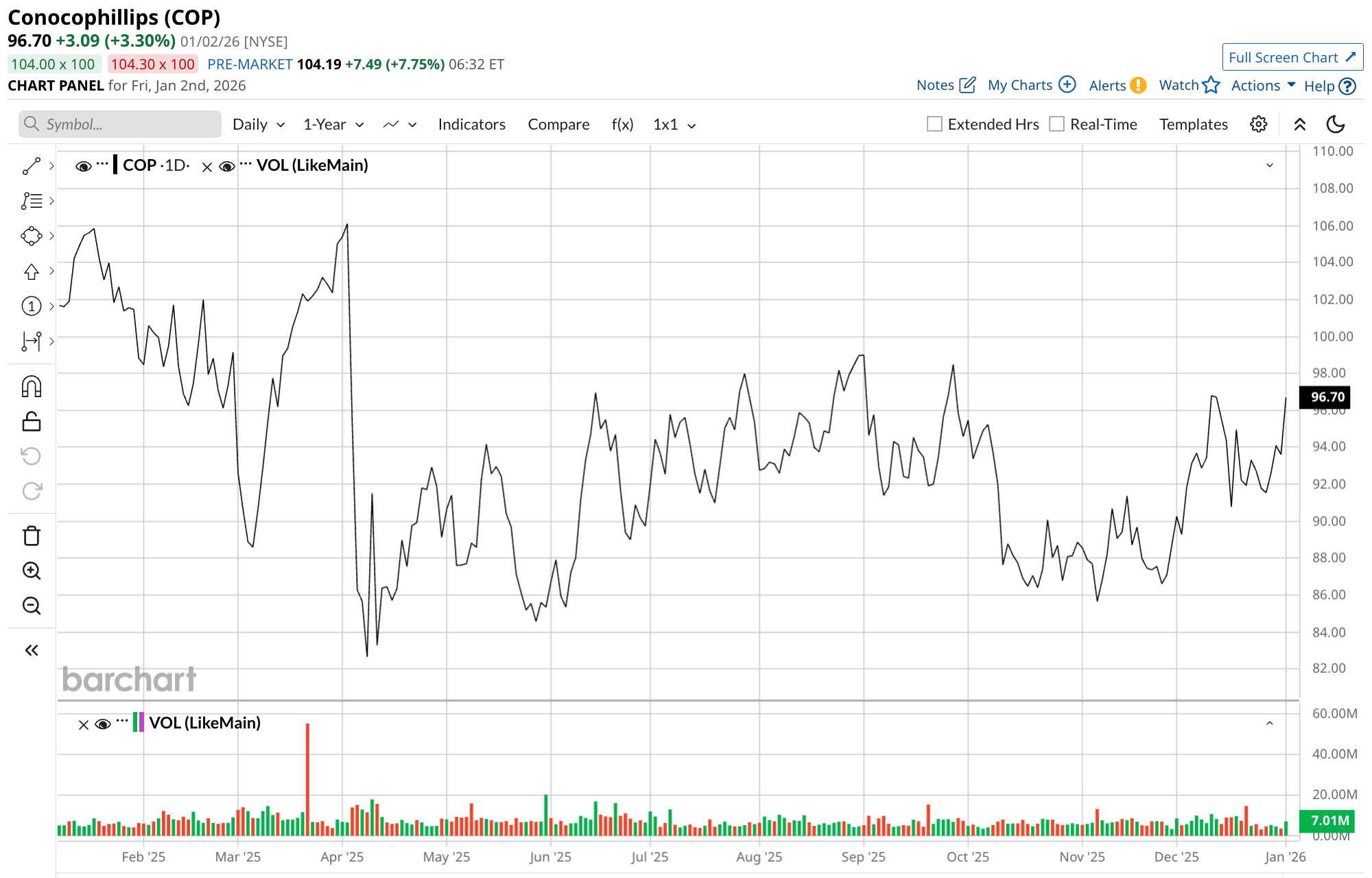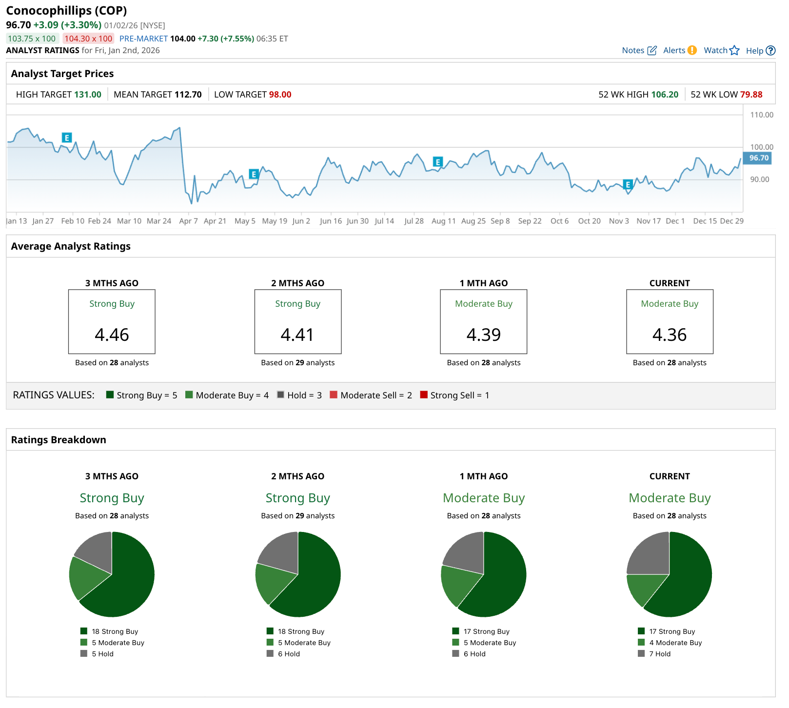 The mean price target is $112.70, derived from analyst forecasts emphasizing low-cost assets and growth in unconventionals. It represents potential upside of 16.5% from its closing price of $96.70 on Friday before the Venezuelan events unfolded, positioning COP for outperformance in a recovering global oil market.