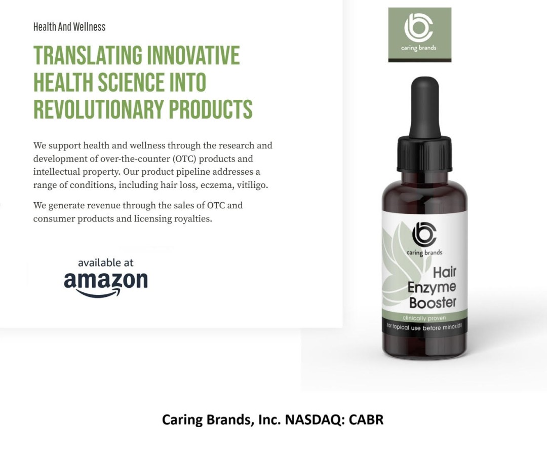 Caring Brands Inc. (Nasdaq: CABR) has a growing portfolio of unique, patented, and clinically validated products for skin and hair growth. CABR intends to launch a total of 5 products over the next 2 years in addition to in-licensing additional products. CABR management has a successful track record of strategic acquisitions, rapid product development, IP development and product licensing. Revenues from the sales of Hair Enzyme Booster for the treatment of hair loss, and Photocil for the treatment of psoriasis and vitiligo, are currently being generated by direct sales in the US and licensees in India. Additional product opportunities include CB-101 for the treatment of eczema, NoStingz, a sunscreen that prevents jellyfish stings.