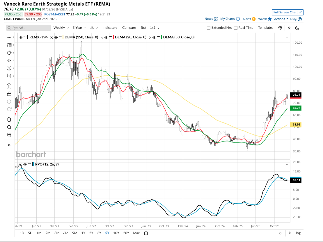 The Vaneck Rare Earth Strategic Metals ETF (REMX) was hot during parts of 2025, since these materials are critical for AI’s takeover of our daily lives. Compound that with where they are located, primarily in China, and you have the makings of a high demand/low supply balance. Which as I recall from my economics classes in college last century, means upward pressure on prices.