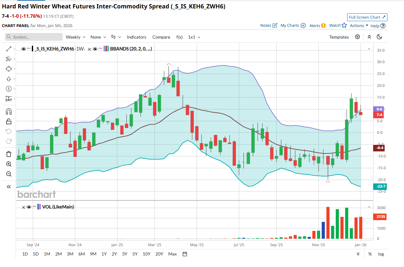 Corn, soybeans, and wheat started the first full week of the new year on the plus side as managed money flow provided support. This was a correction from money flow out of the markets that weighed on futures to finish 2025. Managed funds had sold aggressively since the Christmas rally, and we have close to 100k in Chicago so some short covering is not unexpected in my opinion amid the technical traders may favor the long side this week that will also like the short-term outlook perhaps. However, I still feel that bearish fundamentals will limit rallies. The USDA WASDE report next Monday at 11am will offer little to the wheat market for bullish data with the focus on soybeans and corn. Delayed data regarding export sales report as well as export inspections not pointing to anything bullish from the releases. USDA may need to increase export sales a bit in the WASDE report but will not make a big difference for the US balance sheet in my opinion. The January report usually offers the least number of surprises versus corn and beans in my view. World cash markets are quiet with no major tenders, and cash bids are unchanged out of the Black Sea. The US crop is dormant, and the only change coming to acreage is determined by spring weather (spring wheat) and abandonment (winter wheat) in the January report., Weather – still see this warm/dry pattern in place for the US Southern Plains continuing in the maps that will keep the wheat growing but needing moisture. Crop scouts note that the Hard Red Winter (KC Wheat) stands are good right now, but SRW and WW are not great. Moisture deficits emerging in the Southern Plains should thy occur is key for KC trading above Chicago. Funds ae only short 18K KC vs 100K short Chicago. That is wide. If weather become an issue, we could see Chicago gain and go to a premium vs KC as funds have way more to unwind than KC. Chart below.