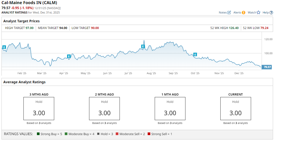 Cal-Maine’s stock was highly volatile in 2025. Early in the year, shares rallied sharply as avian flu outbreaks dramatically reduced egg supply and drove wholesale egg prices to record levels. In mid-2025, CALM briefly traded in the $120 to $130 range. Since then, the stock has pulled back, giving up early gains, and was down about 22% year-to-date (YTD) as the year closed. The pullback is partly due to oversupply in the egg market and weak consumer demand following the HPAI-driven price spike. Overall, the stock remains substantially lower than its mid-year peak, even as the company delivered solid fundamentals.