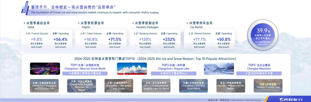 According to Trip.com data, from December 19 to 21, both online travel bookings and consumer spending in Jilin rose by more than 45% compared with the previous period, while year-over-year growth reached approximately 15%. Winter destinations such as Changchun, Jilin City, and Baishan all posted year-over-year increases of over 15% in online bookings, with Baishan standing out at 37%. As the province's main hub, Changchun led with 730,000 online bookings, followed by Yanbian with 270,000, showing the strong consumption momentum across Jilin during the season.