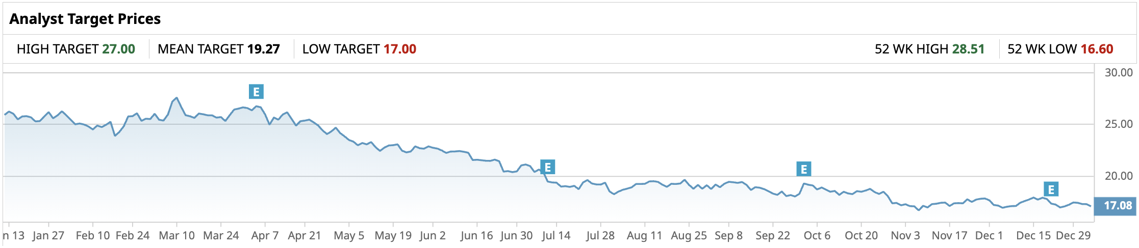 Wall Street analysts think the same way. The mean price target sits at $19.27, a hair above the current price of about $17.