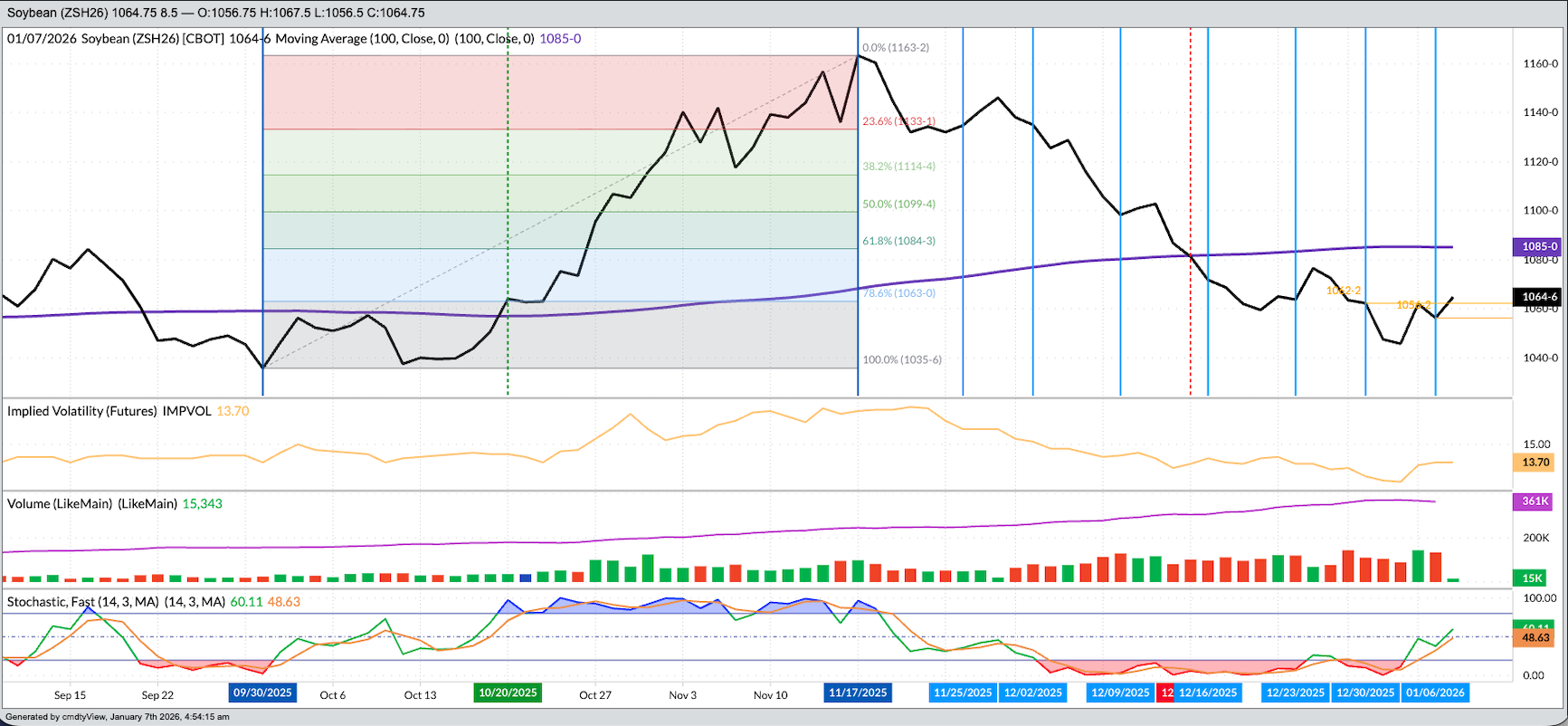 Soybeans: As previously mentioned, the big story in the Grains sector overnight was the oilseed sub-sector. As of this writing the March soybean contract (ZSH26) was up 9.0 cents (0.85%) after rallying as much as 12.25 cents overnight on trade volume of nearly 15,000 contracts. This could still be considered light trade activity, raising the question of if it was actual commercial buying or continued noncommercial interest in March, with the nearby January in delivery and headed toward its last trading day on Wednesday, January 14. The latest Commitments of Traders report, as of Tuesday, December 30, showed a noncommercial net-long futures position of 121,810 contracts, a decrease of 35,970 contracts from the previous week. Tuesday’s close, with March down 5.75 cents for the day, saw the more heavily traded contract finish the positioning week with a loss of 6.0 cents indicating we should see another decrease in the net-long futures position in the next weekly update set for release Friday afternoon. That being said, I would expect another announced export sale later Wednesday morning[i]. Fundamentally, the National Soybean Index came in 5.0 cents below Monday’s calculation, meaning national average basis firmed indicating an uptick in immediate-term demand. We’ll see what subsequent weekly export sales and shipments updates show.