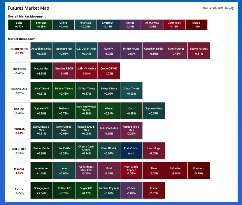 Morning Summary: Once again, the first two talking points on CNBC’s financial program Squawk Box Europe Wednesday morning were: 1) The US president said Venezuela would “give” 50 million barrels of its oil to the United States, an amount roughly valued at $3 billion. 2) The US Secretary of State stating the US administration is looking to buy Greenland rather than take it over militarily. Naturally, the US president contradicted this statement. As I said earlier this week, US activity in Venezuela wasn’t about democracy, or the latest weapons of mass destruction (aka drugs), it was about the oil. Now it seems the plan is for the US to use its ill-gotten gains from Venezuelan oil to buy Greenland. I’m sure in some corner of the Oval Office, this makes sense. (Think about that sentence for a moment.) As for markets, it was another wild night with Metals showing the largest selloff. Silver led the way down as the March futures contract (SIH26) dropped as much as $2.94 (3.8%). As for Crude Oil, the spot-month WTI contract (CLG26) slipped as much as $1.37 (2.5%) while Brent (QAH26) slid as much as $1.25 (2.1%). I’ll close this segment with a comment from the program’s co-host Karen Tso, “Unless something is for sale, it is hard to buy it.”