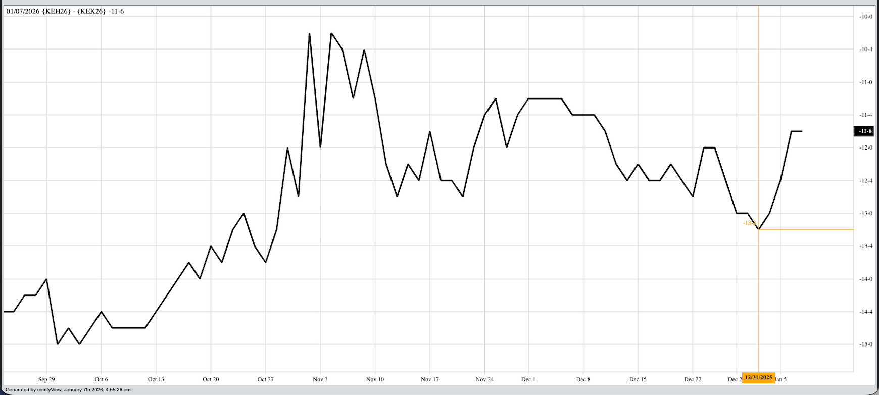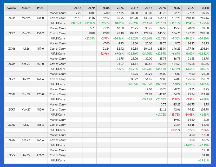 Wheat: The wheat sub-sector was quietly higher pre-dawn Wednesday. In the HRW market we see something similar to what was discussed with soybeans, where nearly all the trade occurred in the nearby March issue. March HRW (KEH26) was up 2.75 cents and one tick off its session high on trade volume of about 1,800 contracts as of this writing. Further out, the May issue could only muster 800 contracts traded while new-crop July had yet to reach 300 contracts. Well after the dust had settled on Tuesday’s close, my friend in the brokerage industry updated me with option traders were buying HRW calendar spreads. This hints at possible changes continuing to be seen in our fundamental reads. Recall last Friday’s national average basis calculation came in at 64.5 cents under March futures, as compared to 72.75 cents under the previous Friday. Yes, national average basis was still weak given the previous 5-year low weekly close was 59.0 cents under March. But that was a sizeable swing as the Krampus Countdown[ii] came to an end for another year. Additionally, the March-May spread has moved from a carry of 13.25 cents and covering 60.5% calculated full commercial carry on December 31 to 11.75 cents and 53.6% at Tuesday’s close.