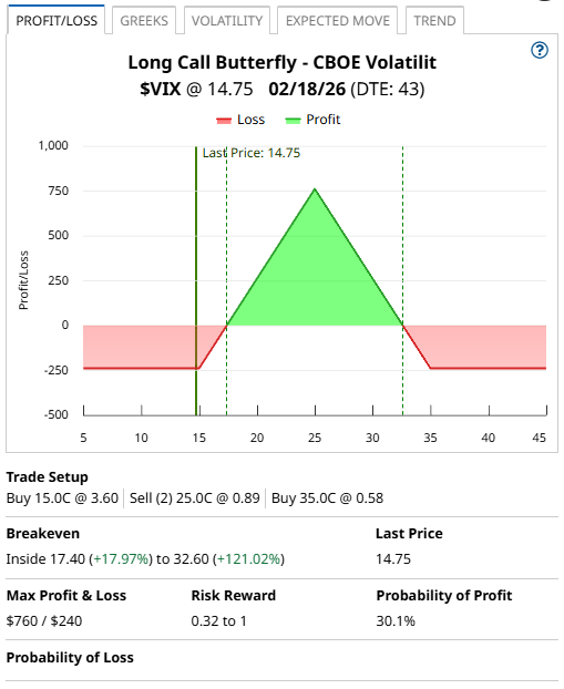 The cost for the trade would be $250 which is the most the trade could lose. The maximum potential gain is $750, which would occur is VIX closed right at 25 at expiration. The lower breakeven price is 17.40 and the upper breakeven price is 32.60.
