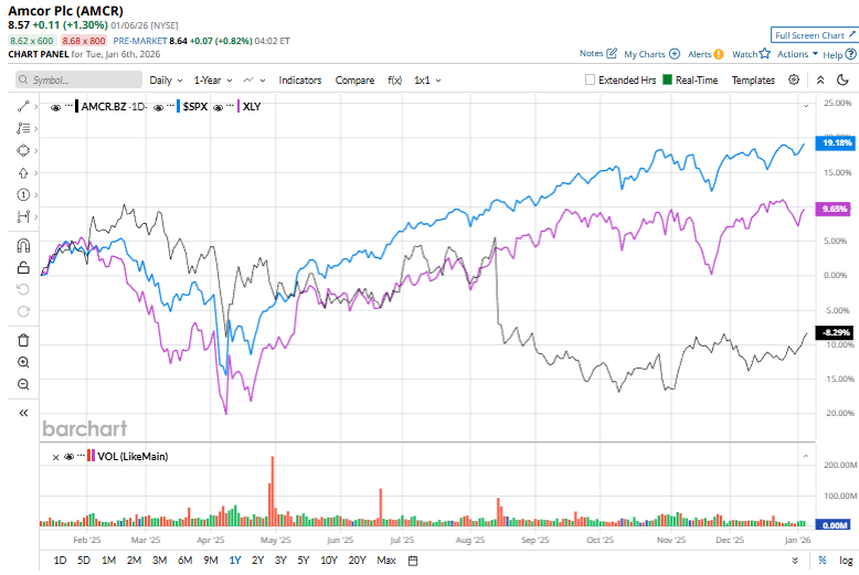 AMCR stock has dipped 9.1% over the past year, significantly underperforming the S&P 500 Index’s ($SPX) 16.2% gains and the Consumer Discretionary Select Sector SPDR Fund’s (XLY) 6.8% gains over the same time frame.