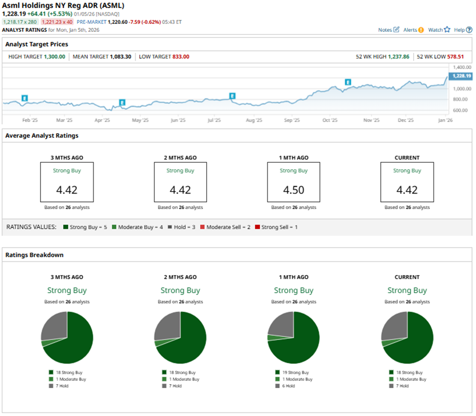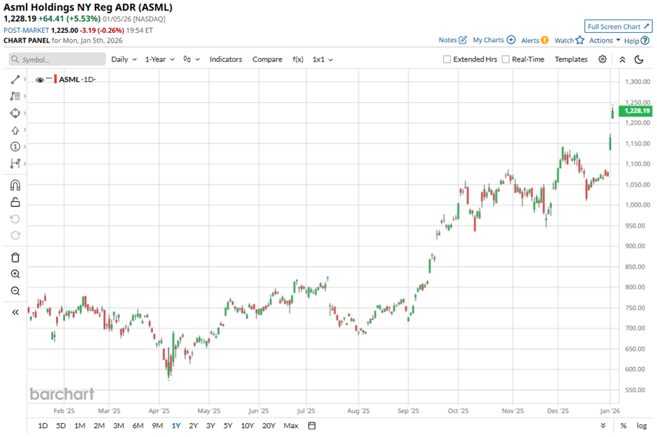 Recent analyst upgrades — particularly the one by Aletheia Capital — pushed shares of ASML to a fresh 52-week high of $1,246.38 on Jan. 6. Intraday gains this week signal strong investor interest and bullish sentiment building around the firm's future growth prospects. While the stock has experienced occasional pullbacks and volatility tied to earnings results, macroeconomic concerns, and geopolitical headwinds earlier in 2025, the latest trend reflects renewed momentum and a strong rebound.