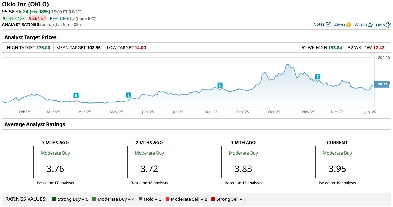 According to Barchart, the consensus rating on Oklo stock currently sits at “Moderate Buy” with price targets going as high as $175 indicating potential upside of more than 80% from here.