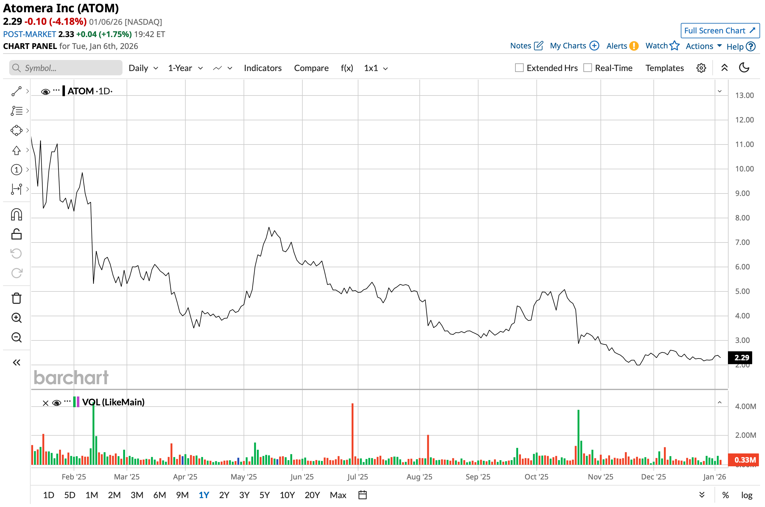 Valued at a modest market cap of $74.8 million, the ATOM stock has dropped like an atom bomb over the past year, correcting by 85.9%.