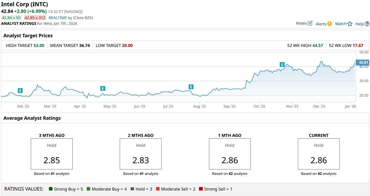 The consensus rating on Intel stock sits at “Hold” only, with the mean target of about $37 indicating potential downside of nearly 14% from here.