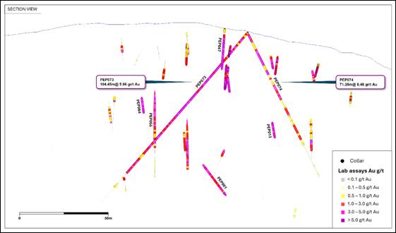 PEP074 - 71.35m @ 6.46g/t Au from surface