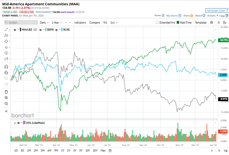 MAA has declined 9% over the past 52 weeks, lagging behind both the S&P 500 Index's ($SPX) 17.1% return and the Real Estate Select Sector SPDR Fund’s (XLRE) marginal uptick over the same time frame.