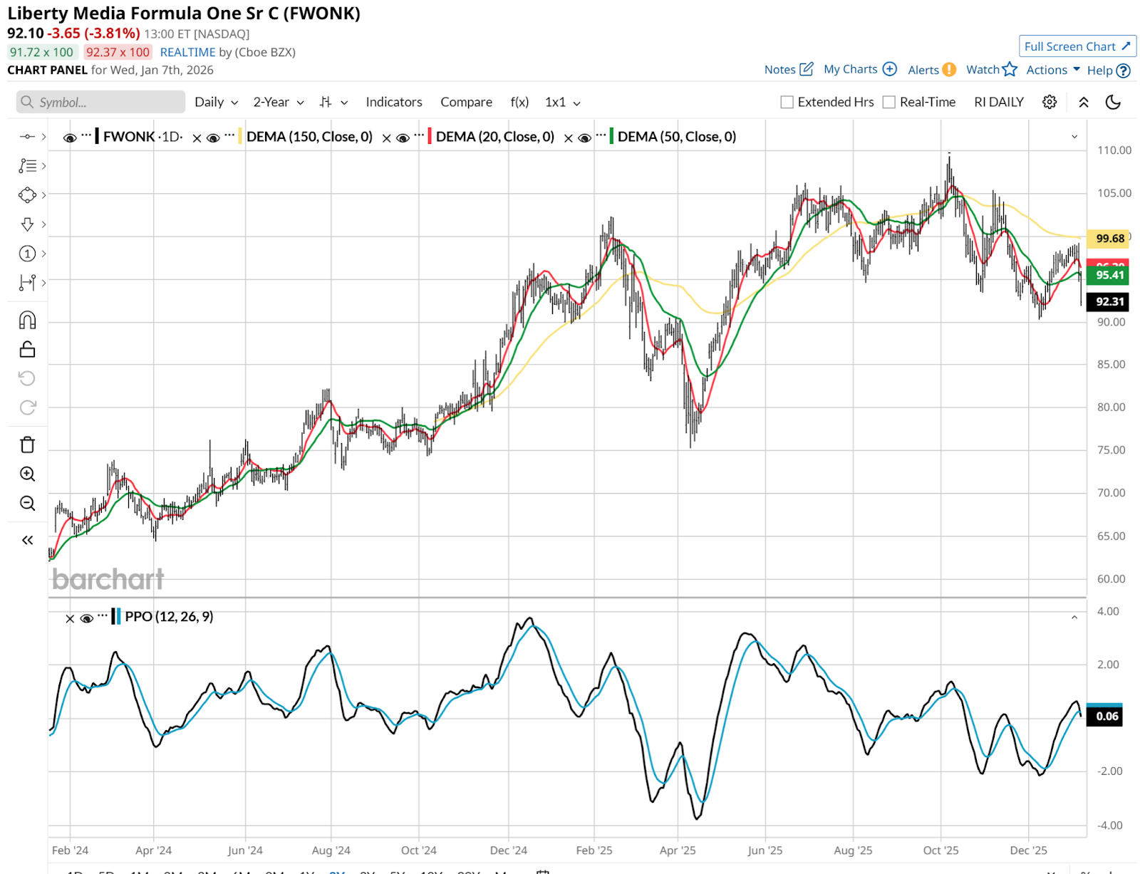 Liberty Media (FWONK): This is not a great-looking chart, but there will be times when this whole theme will fade for a while. Like whenever the market is concerned about consumer spending.