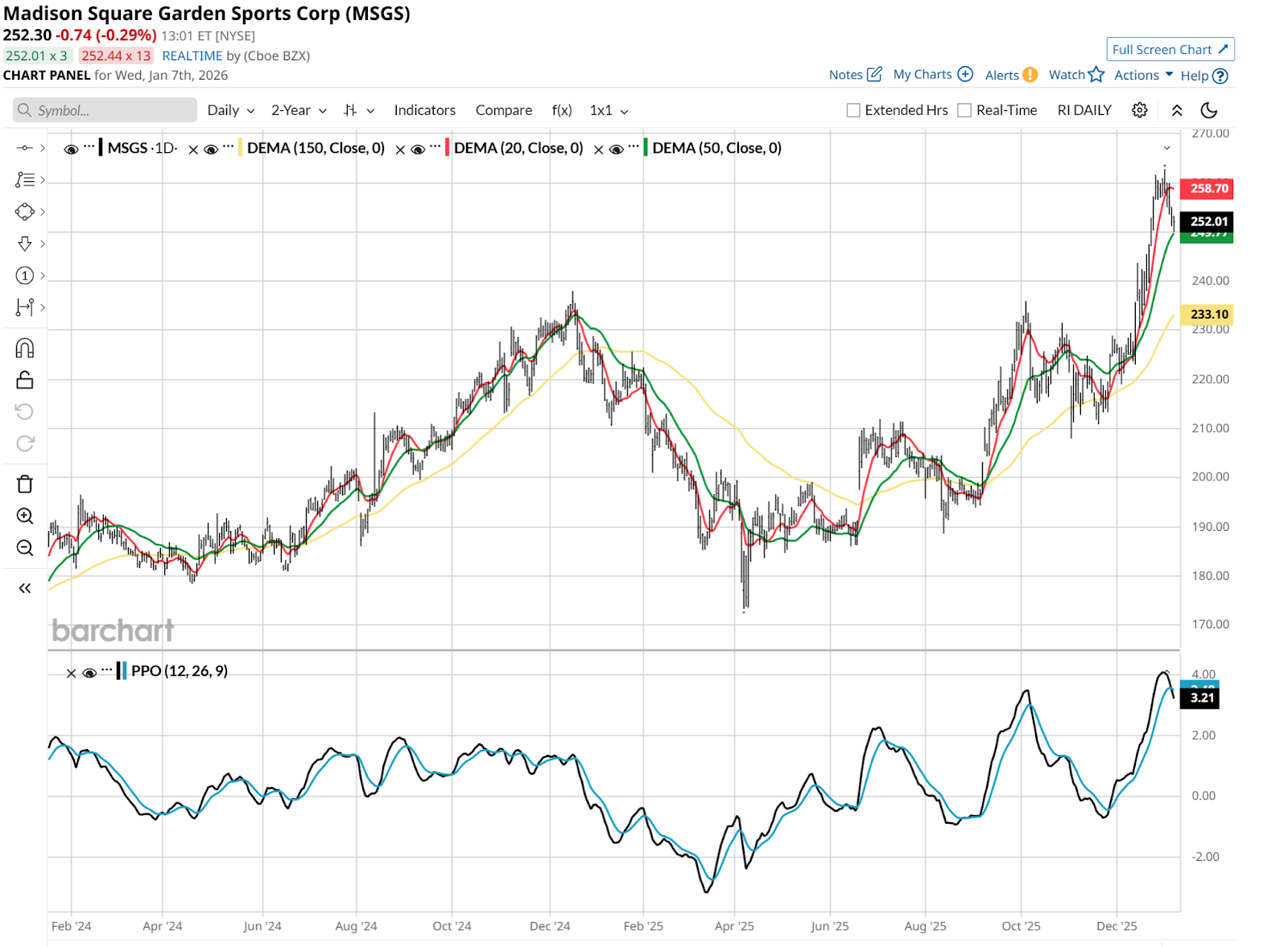 Madison Square Garden Sports Corp (MSGS): The chart looks vulnerable as well, but from a different angle. That’s a nice runup since August. But I’m dismissing it technically as a hot streak. So let’s look at one more and see if we go for the “3-peat” on rough-looking charts, or find a blue-chip prospect.