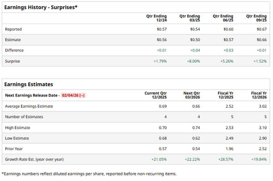 The Corning, New York-based company is slated to announce its fiscal Q4 2025 results soon. Ahead of the release, analysts expect GLW to report adjusted EPS of $0.69, a 21.1% increase from the $0.57 in the year-ago quarter. It has exceeded Wall Street's earnings expectations in the past four quarters.