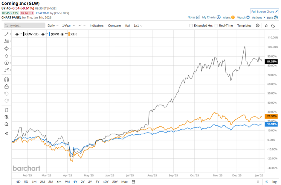 Shares of Corning have soared 83.3% over the past 52 weeks, significantly outpacing the broader S&P 500 Index's ($SPX) 17.1% gain and the State Street Technology Select Sector SPDR ETF's (XLK) 24.9% return over the same period.